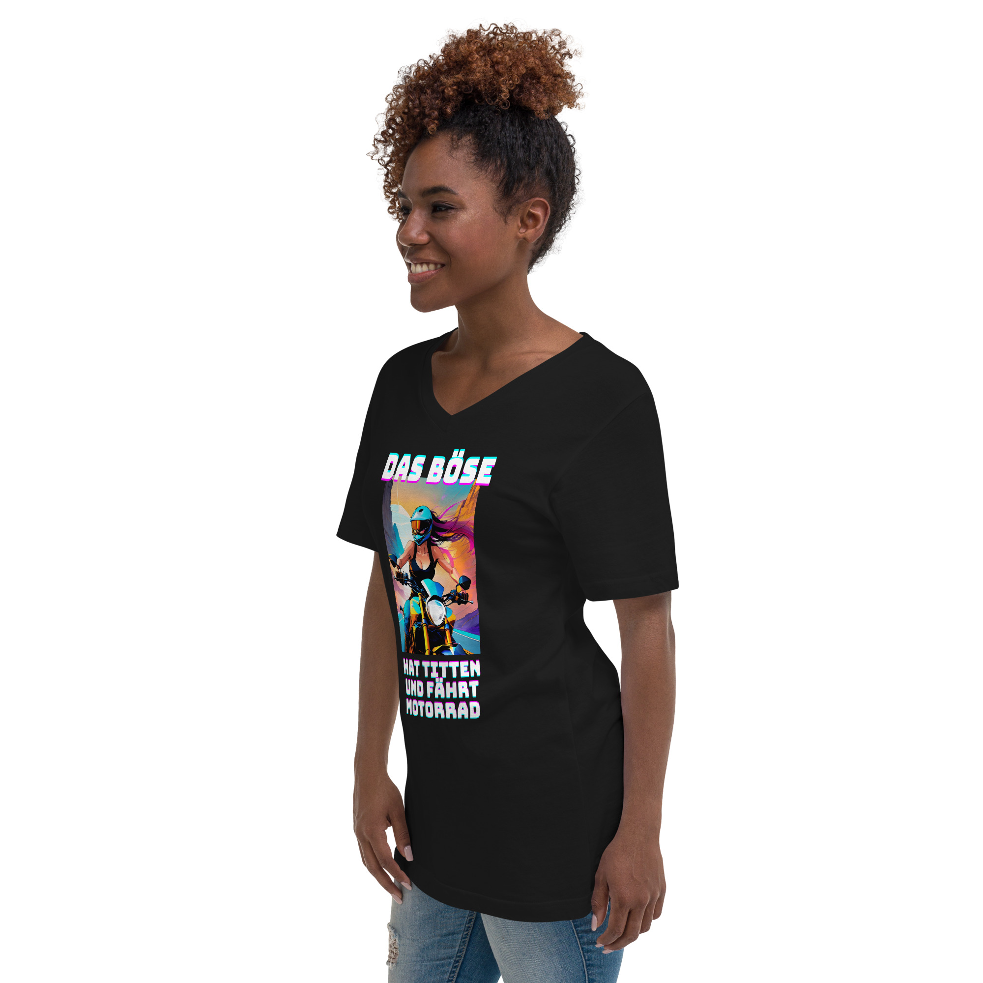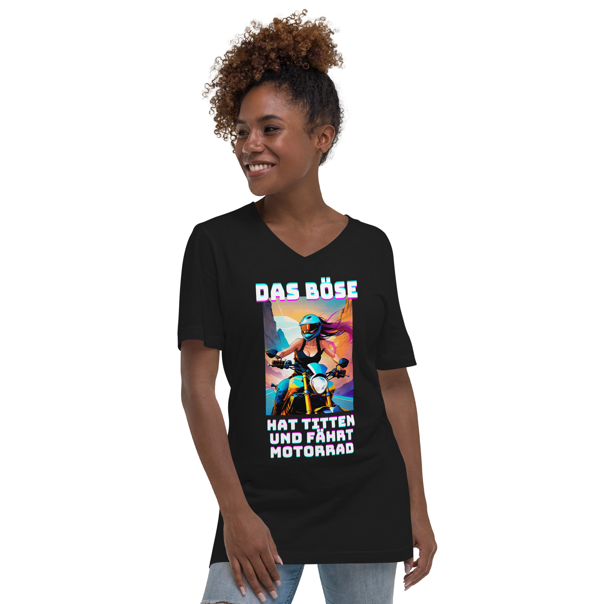 Ein T-Shirt für diejenigen, die wissen, wie man Regeln bricht und Erwartungen herausfordert! Mit dem provokanten Schriftzug ‚Das Böse hat Titten und fährt Motorrad‘ und dem Bild einer Motorradfahrerin in leuchtenden Neonfarben, die durch die kurvigen Bergstraßen pflügt, ist dieses Design eine Ode an die Rebellion und die Freiheit des Ausdrucks. Es ist eine Erinnerung daran, dass Stärke, Mut und Unabhängigkeit keine Geschlechtergrenzen kennen. Trage dieses Shirt und feiere die unkonventionelle Kraft, die in dir steckt, während du die Straßen der Welt mit Stil und Attitüde eroberst.