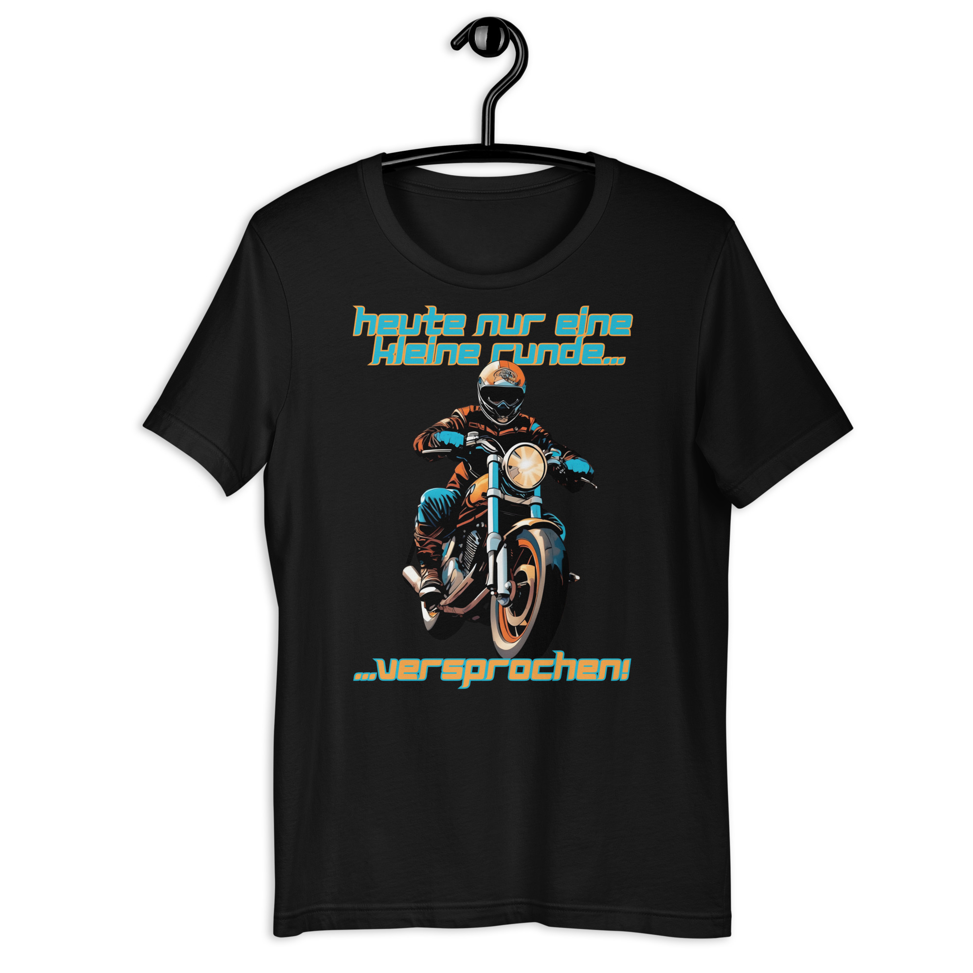 Ein T-Shirt für alle, die wissen, dass ‚eine kleine Runde‘ oft zu den besten Abenteuern führt! Der Schriftzug ‚Heute nur eine kleine Runde… versprochen‘ ist eine Einladung zu spontanen Ausflügen und unerwarteten Entdeckungen. Das Bild eines Motorradfahrers auf transparentem Hintergrund lässt Raum für Fantasie und Vorstellungskraft – genau wie die endlosen Möglichkeiten einer kurzen Fahrt. Trage dieses Shirt und sei bereit, dich auf das Unbekannte einzulassen, denn manchmal sind die besten Erlebnisse diejenigen, die spontan entstehen und die Runde dann vielleicht doch nicht so klein bleibt wie versprochen