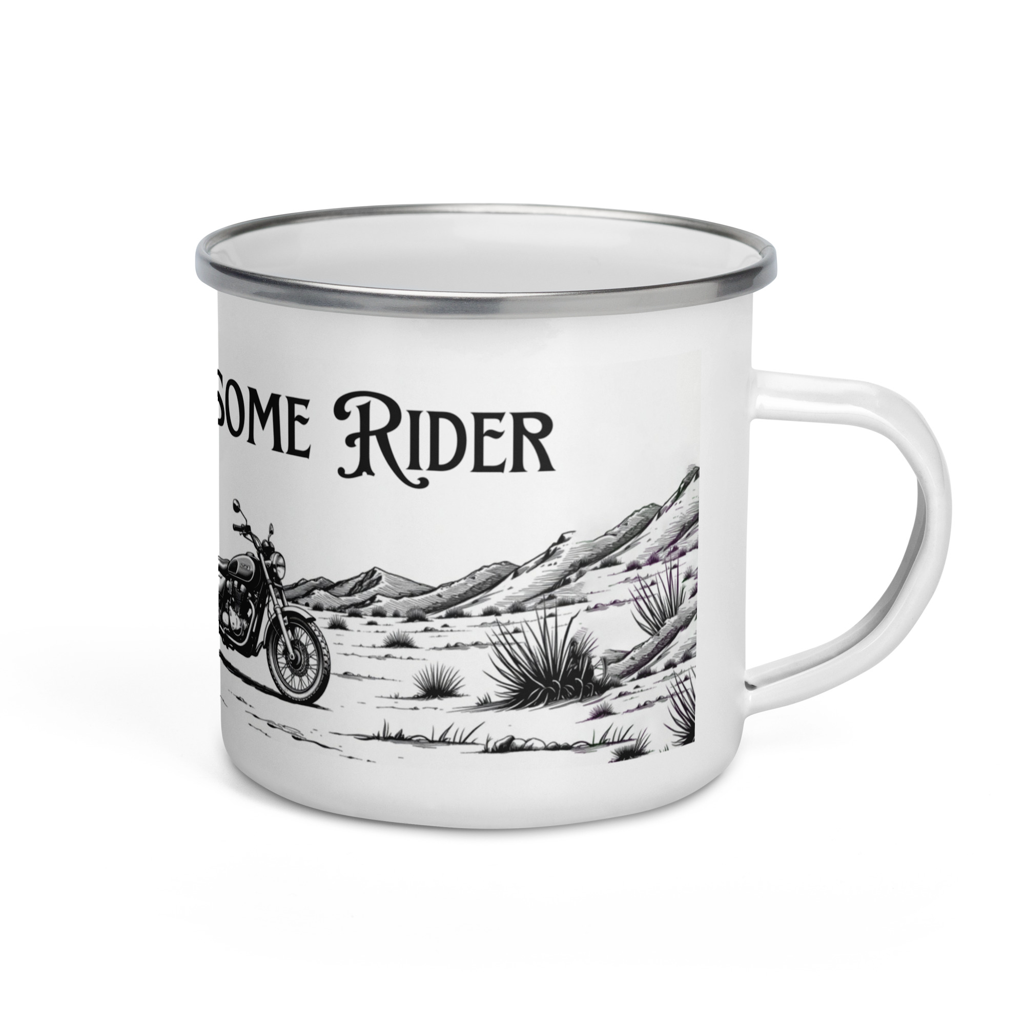 Tauche ein in die Welt von Freiheit, Abenteuer und endlosen Straßen mit der „Lonesome Rider“ Emaille-Tasse.