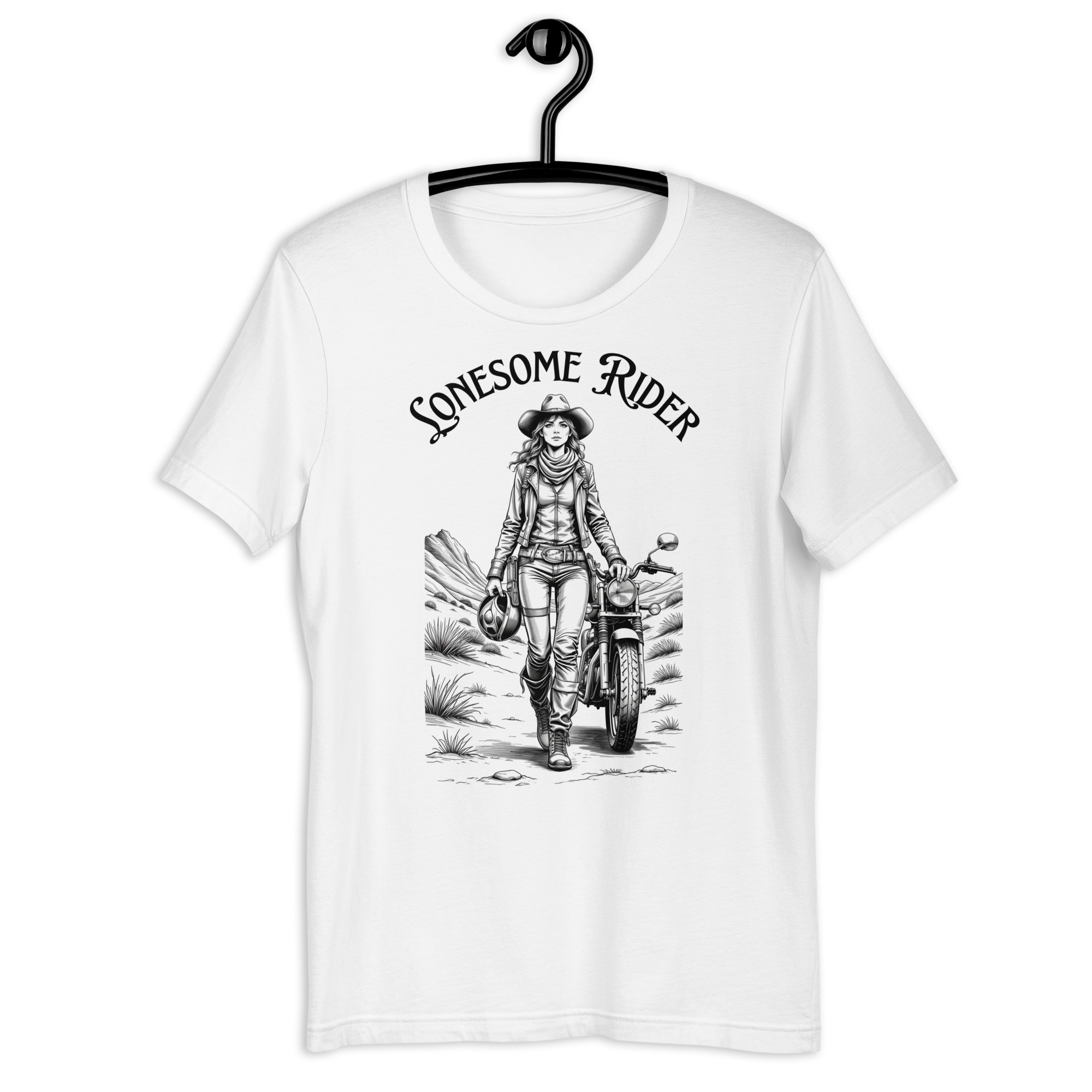 Dieses „Lonesome Rider“ T-Shirt ist gemacht für alle Freigeisterinnen, die das Abenteuer suchen und die Straße lieben.